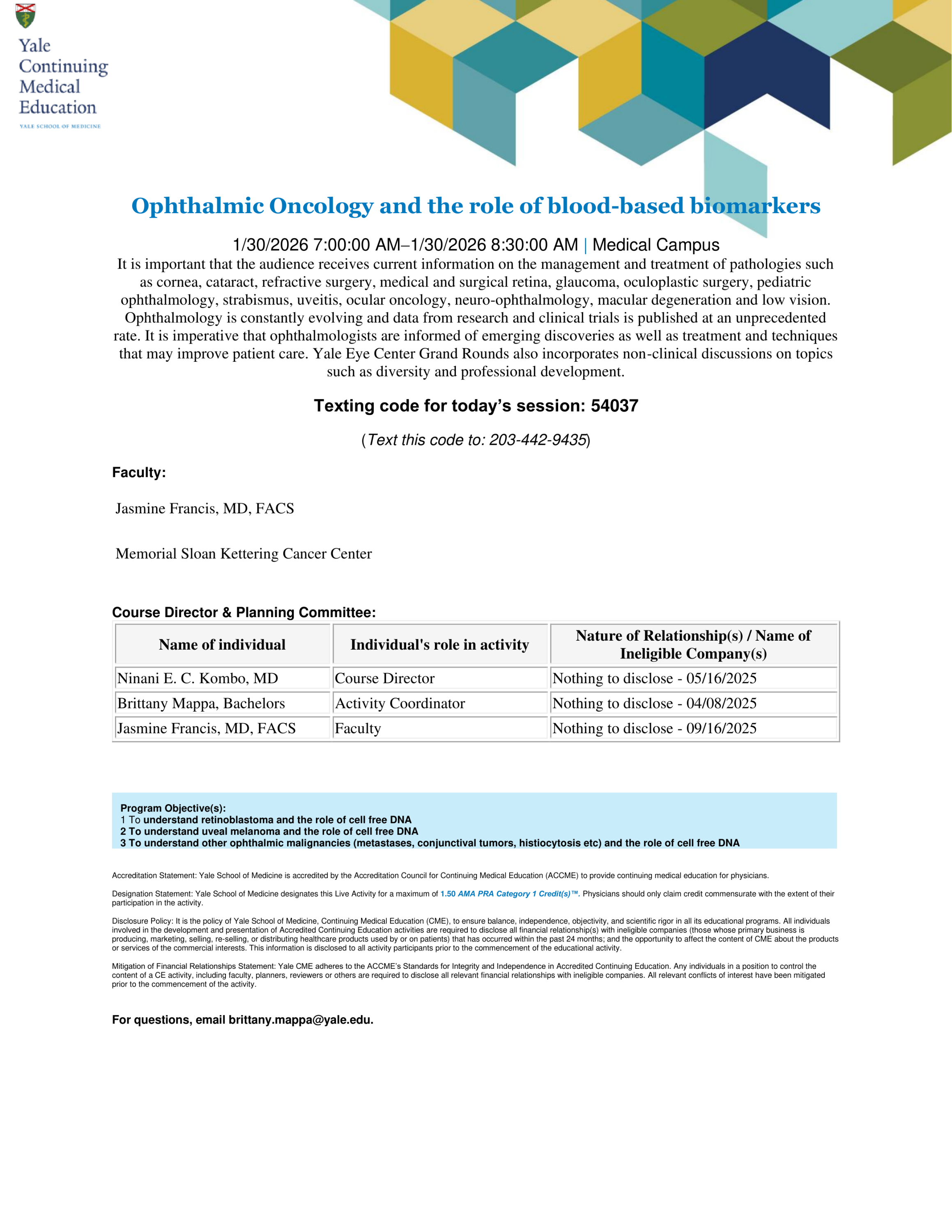 Friday, January 307:00 AM - 8:15 AMYEC Grand RoundsAdd to CalendarPrintShareAudienceEveryoneAdmissionFreeTagGrand RoundsDownload FlyerSpeakerJasmine H. FrancisHostNinani Kombo, MD ContactBrittany Mappa brittany.mappa@yale.edu